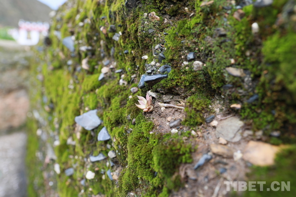 圖為位于四川省甘孜州鄉(xiāng)城縣青德鎮(zhèn)布機(jī)村的宗薩木府的古老夯土女兒墻滿覆青苔 攝影:劉莉