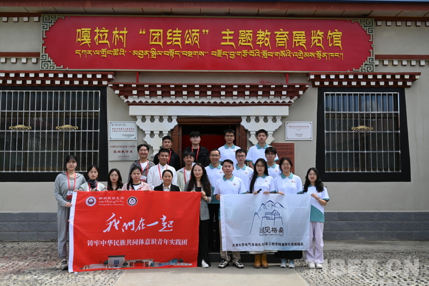 圖為西藏民族大學(xué)實(shí)踐團(tuán)在嘎拉村“團(tuán)結(jié)頌”主題教育展覽館前的合影