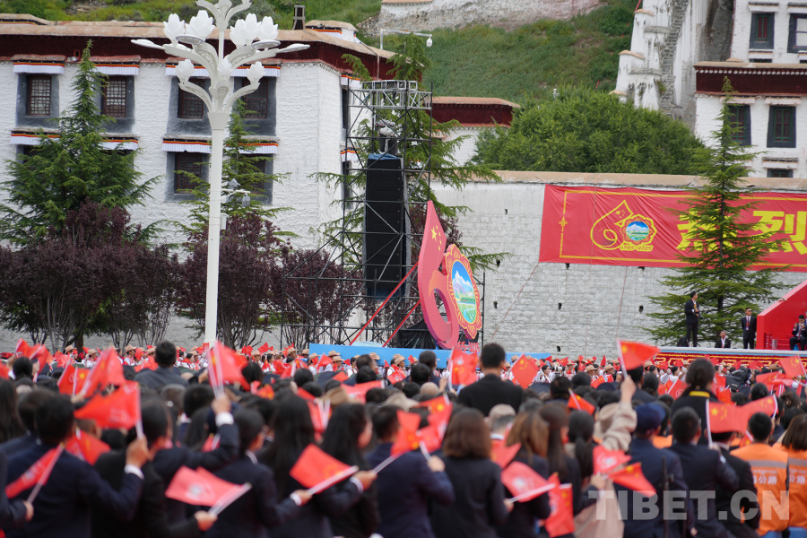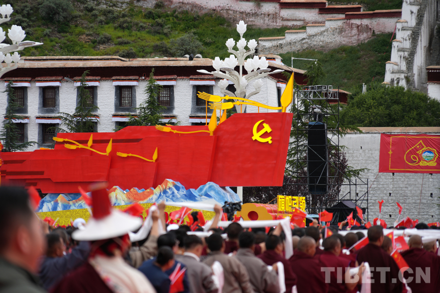 中國西藏網(wǎng)訊 西藏自治區(qū)成立60周年慶祝大會于8月21日上午10時在拉薩隆重舉行。伴隨著歡快的音樂,熱烈歡騰的群眾游行在“旗幟引領(lǐng)”彩車的帶領(lǐng)下正式開始。(中國西藏網(wǎng) 記者/王淑  馮重霖 劉莉 趙釗 姚浩然 楊眉笑 德吉卓瑪 趙振宇 賈華加 邊子捷 次旦拉姆 旦曲)