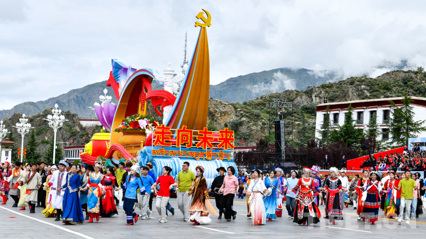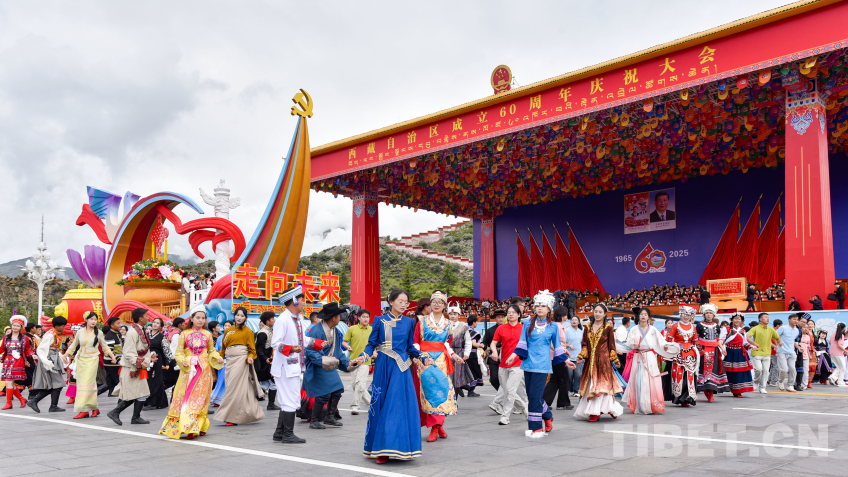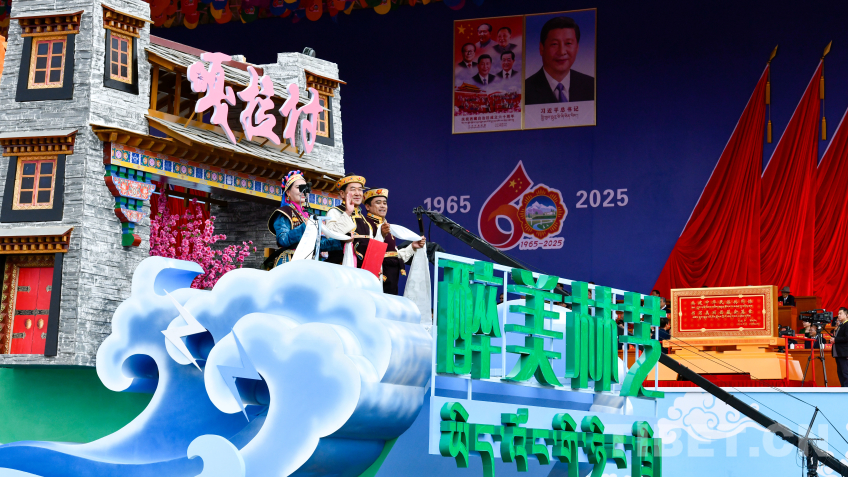 “走向未來(lái)”彩車,整體呈現(xiàn)數(shù)字“60”字樣,車身造型融入華表、紅色飄帶、中國(guó)結(jié)等元素,彰顯了西藏各族干部群眾奮進(jìn)新征程、建設(shè)團(tuán)結(jié)富裕文明和諧美麗的社會(huì)主義現(xiàn)代化新西藏的信心和決心。(中國(guó)西藏網(wǎng) 記者/王淑 趙振宇 德吉卓瑪 次旦拉姆 旦曲 賈華加 趙釗 姚浩然 劉莉 邊子捷 馮重霖 楊眉笑)