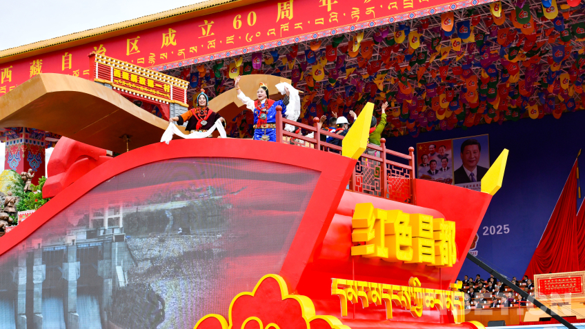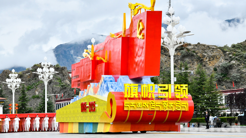 “旗幟引領(lǐng)”彩車,車頭矗立巨型黨旗,八面五星紅旗有序排列其后,展現(xiàn)了在黨中央堅(jiān)強(qiáng)領(lǐng)導(dǎo)下,西藏各族兒女同心同向、團(tuán)結(jié)奮進(jìn)的時(shí)代圖景。