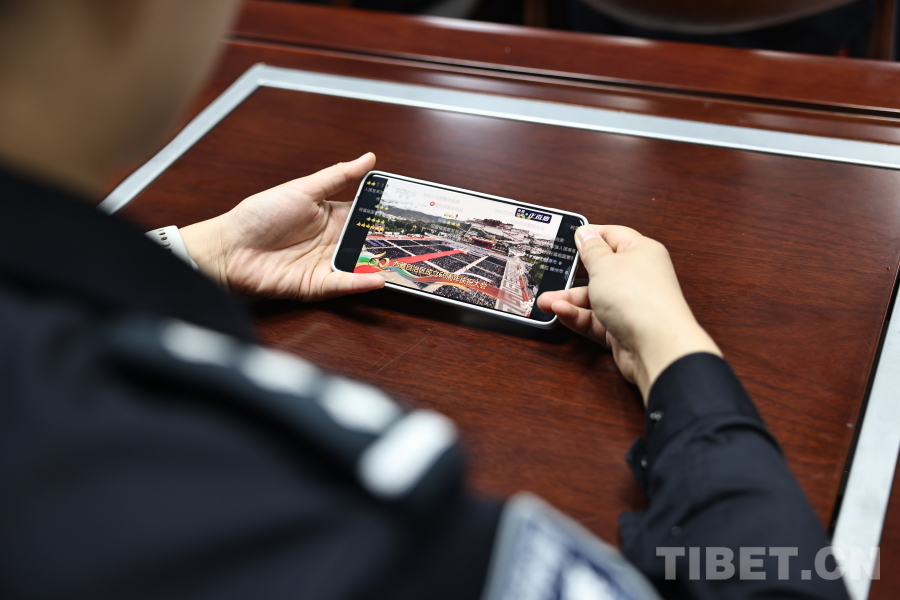 圖為聶拉木出入境邊防檢查站民警利用手機(jī)觀看西藏自治區(qū)成立60周年慶祝大會(huì)