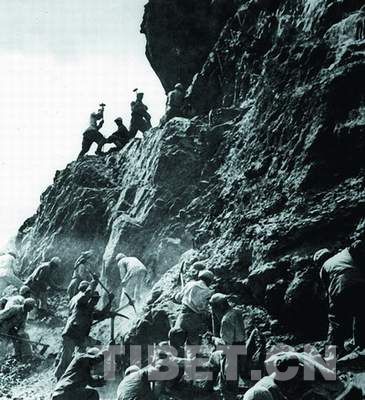 資料圖:十八軍筑路部隊在絕壁上鑿路