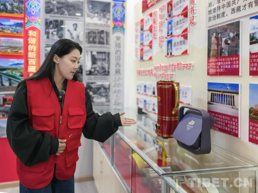 在社區(qū)回憶館內(nèi),有一排展柜精心展出了歷年來中央代表團(tuán)贈予西藏各族各界干部群眾的禮物。從西藏自治區(qū)成立三十周年時(shí)的鐘表,到西藏自治區(qū)成立六十周年時(shí)的全自動酥油茶壺,德吉措姆說這些禮物滿載著黨中央對西藏各族群眾深情厚誼,每一件禮物都是當(dāng)時(shí)各族群眾日常生活所切實(shí)需要的,禮物的變化也見證著西藏各族群眾生活的變化。