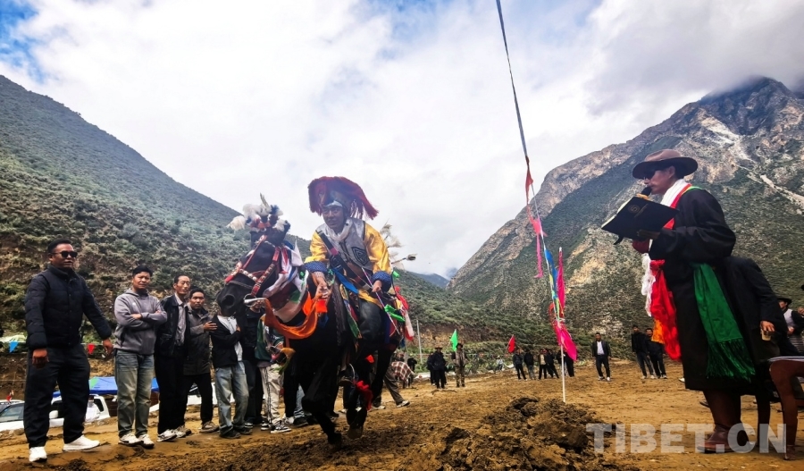 圖為西藏自治區(qū)山南市貢嘎縣昌果鄉(xiāng)普夏村望果節(jié)賽馬會上村里請來的民間藝人(圖右)擔(dān)任主持人介紹出場騎手 攝影:劉莉