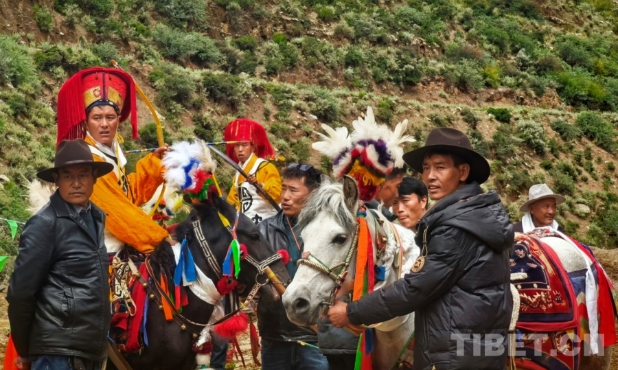 圖為西藏自治區(qū)山南市貢嘎縣昌果鄉(xiāng)普夏村望果節(jié)賽馬會(huì)現(xiàn)場(chǎng),年長村民正在指導(dǎo)年青騎手射箭要領(lǐng) 攝影:劉莉