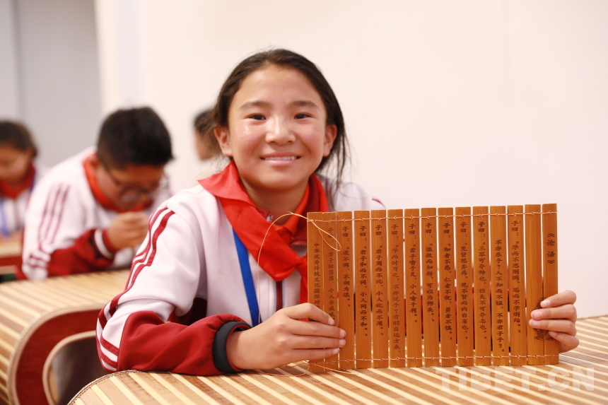 “子曰:‘學(xué)而不思則罔,思而不學(xué)則殆。’‘見賢思齊焉,見不賢而內(nèi)自省也?!卟换?,仁者不憂,勇者不懼。’……”竹簡手工課堂上,孩子們將打磨光滑的刻字竹片用牛筋線仔細(xì)編連成冊。“同學(xué)們要記住,繩子折疊后要保持長度一致,位于竹簡上方的繩子向上穿孔,下面的繩子向下穿孔而過,這樣能保證竹片緊密相連,即‘上上下下’原則?!痹诶蠋熛ば牡闹笇?dǎo)與幫助下,孩子們稚嫩的雙手上下翻飛,很快便將散落的竹簡按照刻字排列整齊,并編織成冊。來自阿里噶爾縣昆莎鄉(xiāng)的巴桑卓瑪說道:“編竹簡需要繩子不斷交織,與藏族的紡織工藝有些相似。通過這次手工,我感受到了古人的智慧與中國傳統(tǒng)文化的神奇奧秘?!闭窍裰窈?、紙張一樣的文化載體,才讓先賢哲人的深邃智慧以文字的形式流傳至今,被千年后的人們傳承誦讀。