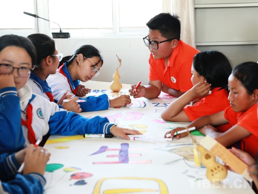 圖為西藏阿里噶爾縣孔繁森小學(xué)、山東聊城堂邑鎮(zhèn)中心小學(xué)的孩子們共同創(chuàng)作迎國(guó)慶主題畫卷 攝影:劉莉