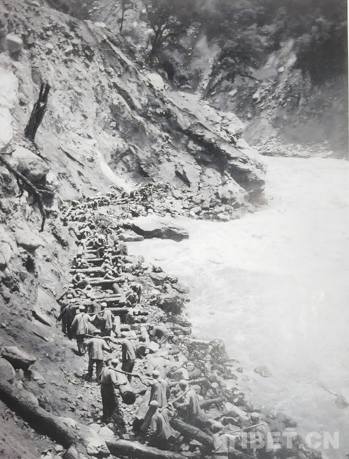 圖為上世紀(jì)50年代初,康藏公路扎木路段(位于今波密與魯朗之間)的筑路現(xiàn)場(chǎng) 作者供圖