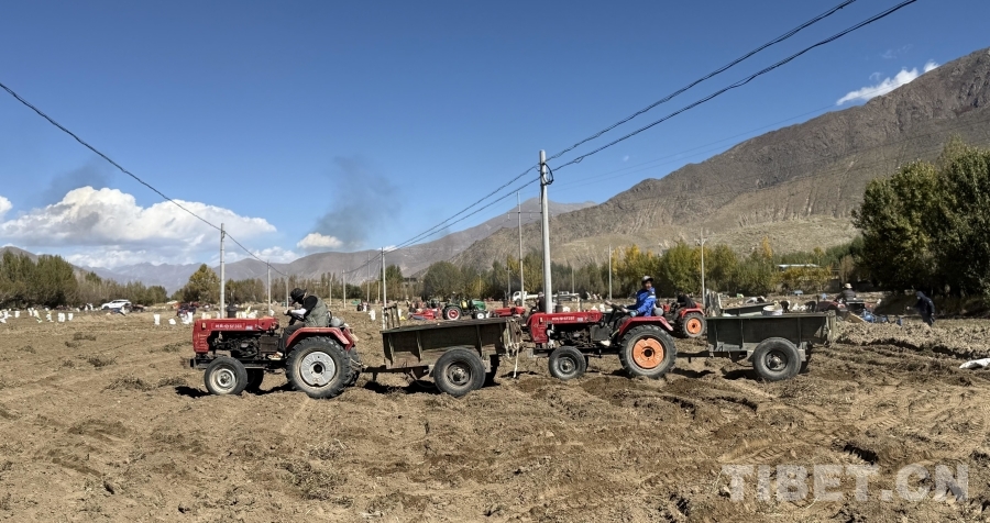 圖為南木林縣艾瑪鄉(xiāng)山巴村村民正在使用機械收獲土豆