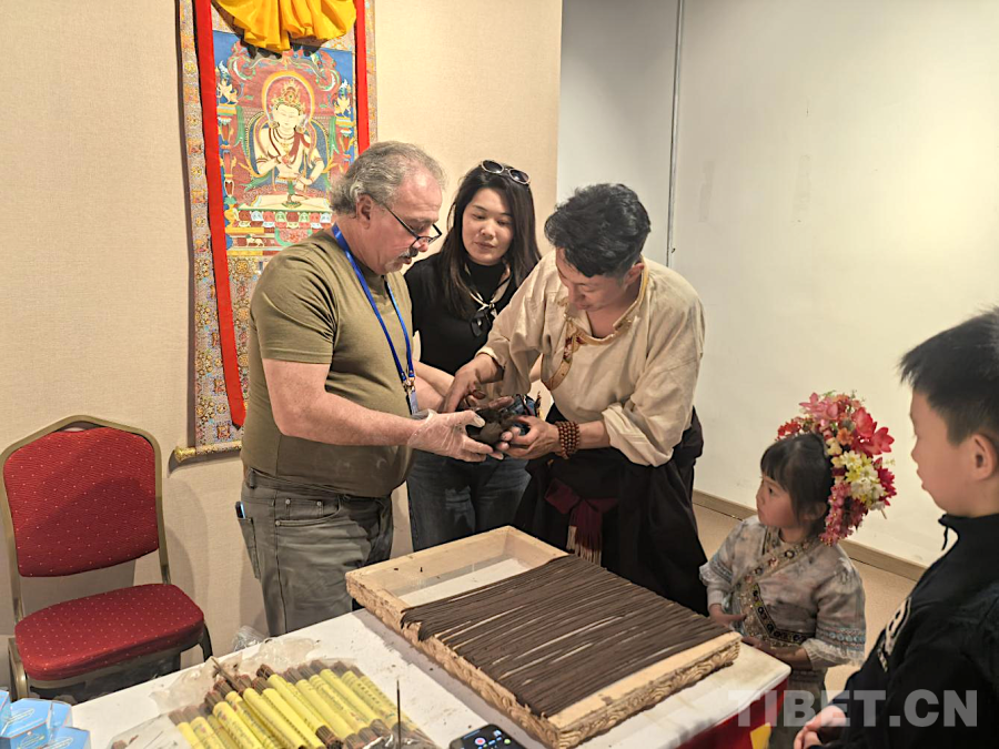 圖為參展現(xiàn)場(chǎng),非遺傳承人正在教外國(guó)游客如何制作藏香