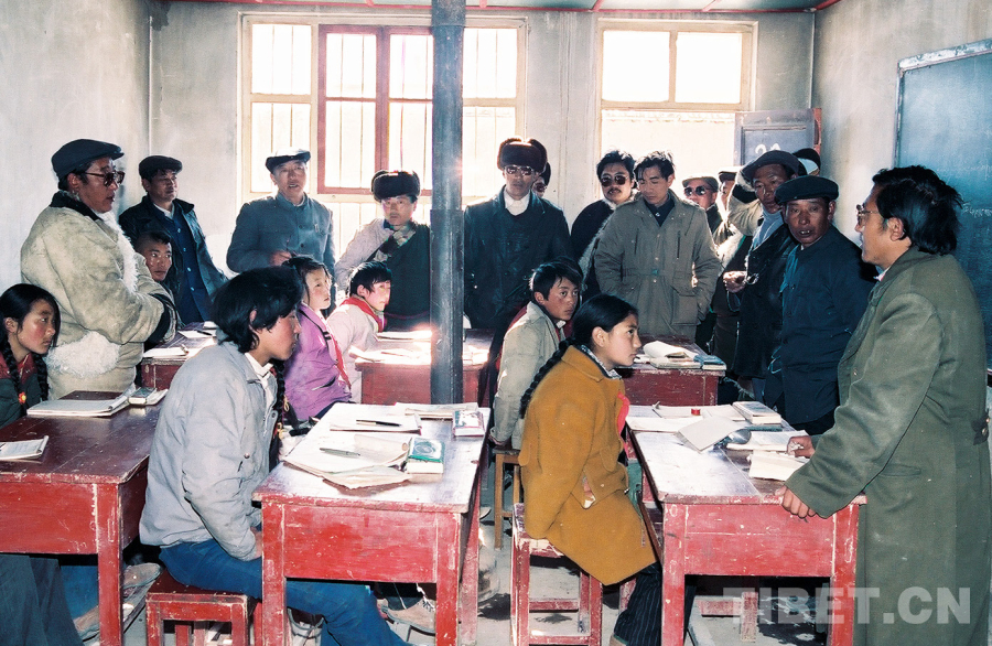 這是參加文部辦事處基層政權(quán)建設(shè)工作現(xiàn)場(chǎng)會(huì)“訪問(wèn)團(tuán)”人員在參觀文部辦事處小學(xué)(唐召明1989年12月份攝)