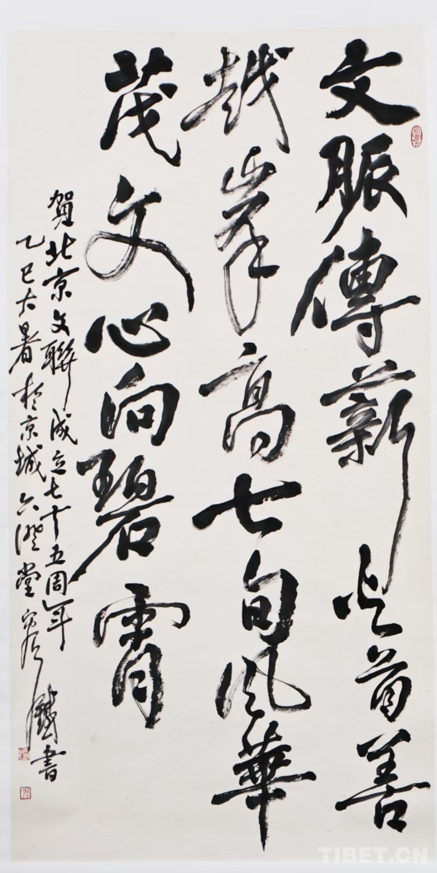捐贈(zèng)儀式上,中國(guó)書(shū)協(xié)理事、中國(guó)美協(xié)理事、西泠印社理事、國(guó)家民族畫(huà)院副院長(zhǎng)、民盟中央美術(shù)院副院長(zhǎng)容鐵向北京市文聯(lián)捐贈(zèng)書(shū)法《文脈傳薪火,首善越峰高,七旬風(fēng)華茂,文心向碧霄》《如意》和繪畫(huà)《岸芷汀蘭》3幅作品,北京市文聯(lián)黨組書(shū)記、常務(wù)副主席馬新明代表市文聯(lián)向容鐵頒發(fā)了收藏證書(shū)。與會(huì)嘉賓對(duì)容鐵先生的藝術(shù)追求給予高度評(píng)價(jià),對(duì)其公益捐贈(zèng)之舉表示由衷敬佩,認(rèn)為此次捐贈(zèng)體現(xiàn)了藝術(shù)家的社會(huì)責(zé)任和時(shí)代擔(dān)當(dāng)。