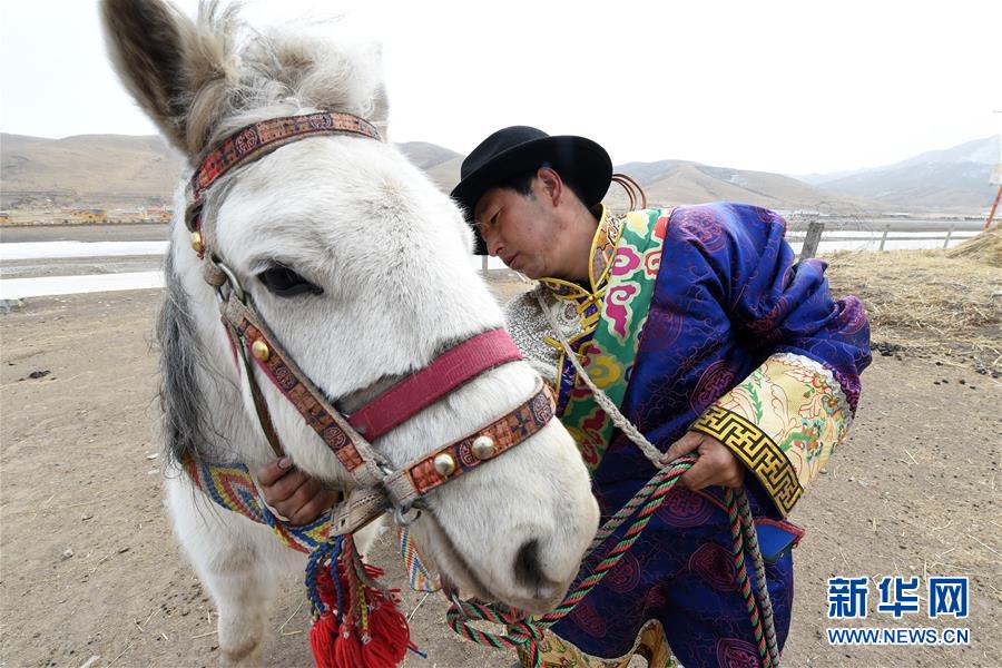 3月12日,在天祝藏族自治縣抓喜秀龍鎮(zhèn)南泥溝村,宋天柱安裝馬鞍。 新華社記者 范培珅 攝