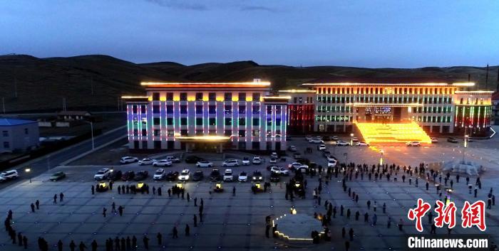 圖為瑪多縣牧民群眾在黃河源廣場上跳鍋莊?,敹嗫h委宣傳部