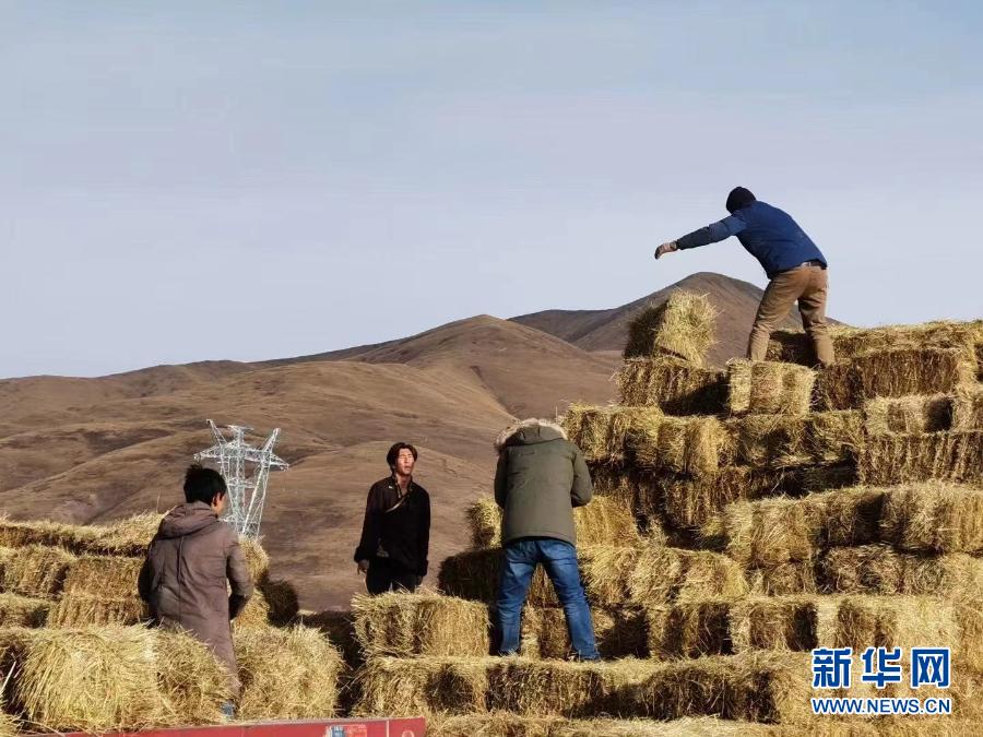 在青海省果洛藏族自治州甘德縣江千鄉(xiāng),牧民在搬運(yùn)飼草(2020年11月3日攝)。新華社記者 解統(tǒng)強(qiáng) 攝