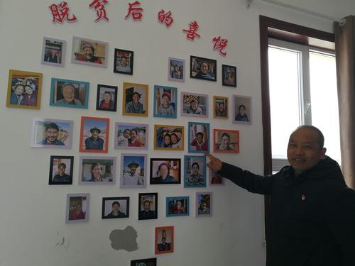青海省黃南藏族自治州尖扎縣尖扎灘鄉(xiāng)來玉村扶貧第一書記李玉棟向記者介紹來玉村“脫貧后的喜悅”。照片墻集納了村民們脫貧后的笑臉照片(2020年12月11日攝)。新華社記者 顧玲 攝