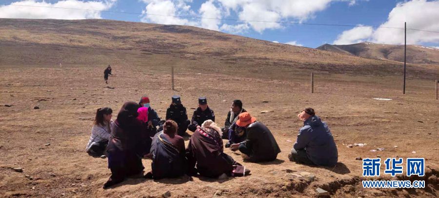 在青海省果洛藏族自治州瑪沁縣優(yōu)云鄉(xiāng),糾紛調(diào)解工作組的多杰扎西(后排穿警服右)、仁青卓瑪(后排穿警服左)和牧民們席地而坐,了解矛盾的詳細(xì)情況(4月18日攝)。新華社發(fā)