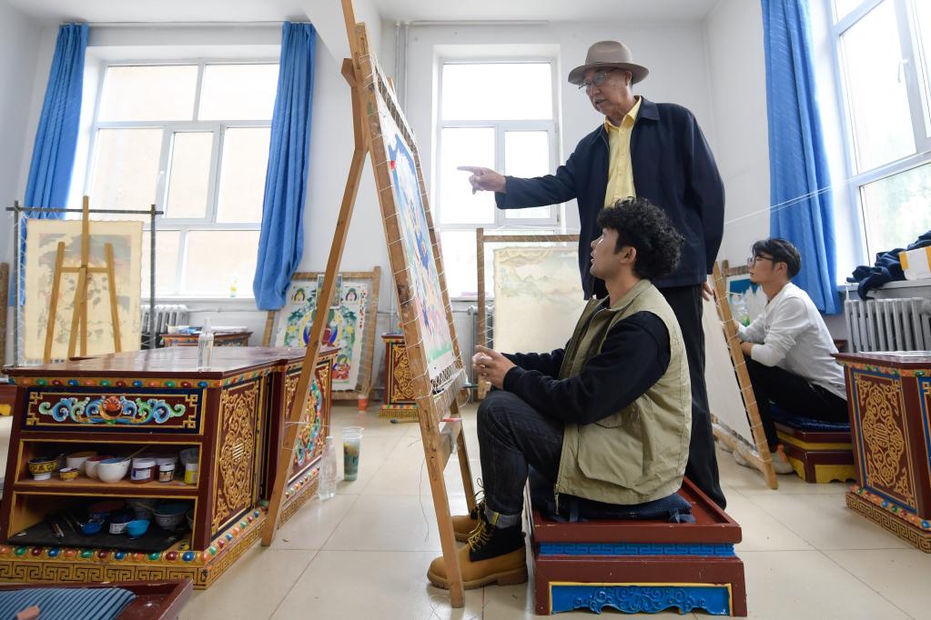 6月17日,在青海民族大學藝術(shù)學院,老師夏吾才讓(中)在指導工藝美術(shù)(唐卡)專業(yè)學生繪制唐卡。新華社記者 張龍 攝