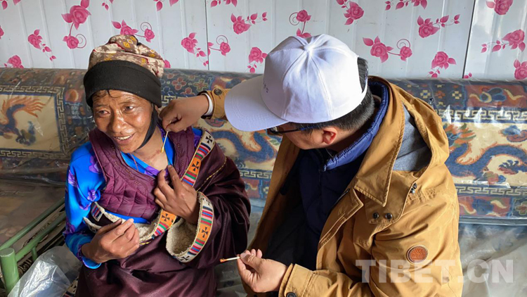 49歲的拉毛羊措則是甲狀腺手術(shù)康復不久,她愛人已經(jīng)去世,和一兒一女及小外孫女一起生活,而女兒也患有肺結(jié)核??吹剿蛠淼乃幬锱c生活用品,拉毛羊措一直用藏語說著“謝謝”,并豎起大拇指,臉上始終帶著發(fā)自內(nèi)心的淳樸笑容。