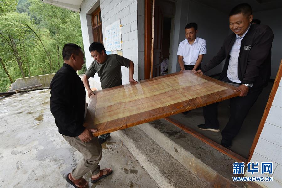 8月7日,在蘭州新區(qū)的新家,虎吾成(右)在村民幫助下擺放沙發(fā)。新華社記者 范培珅 攝