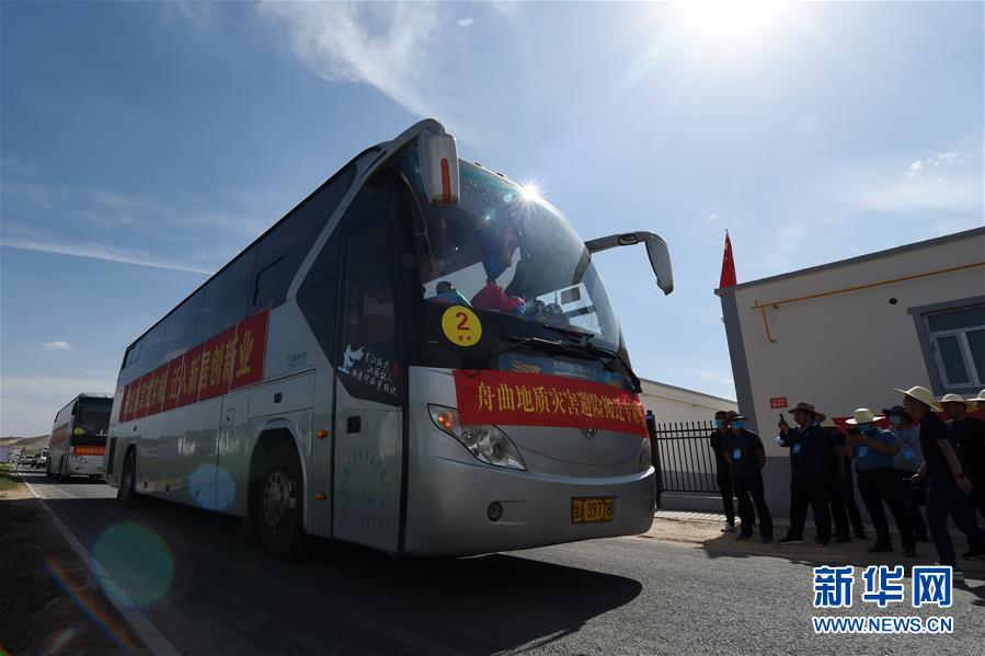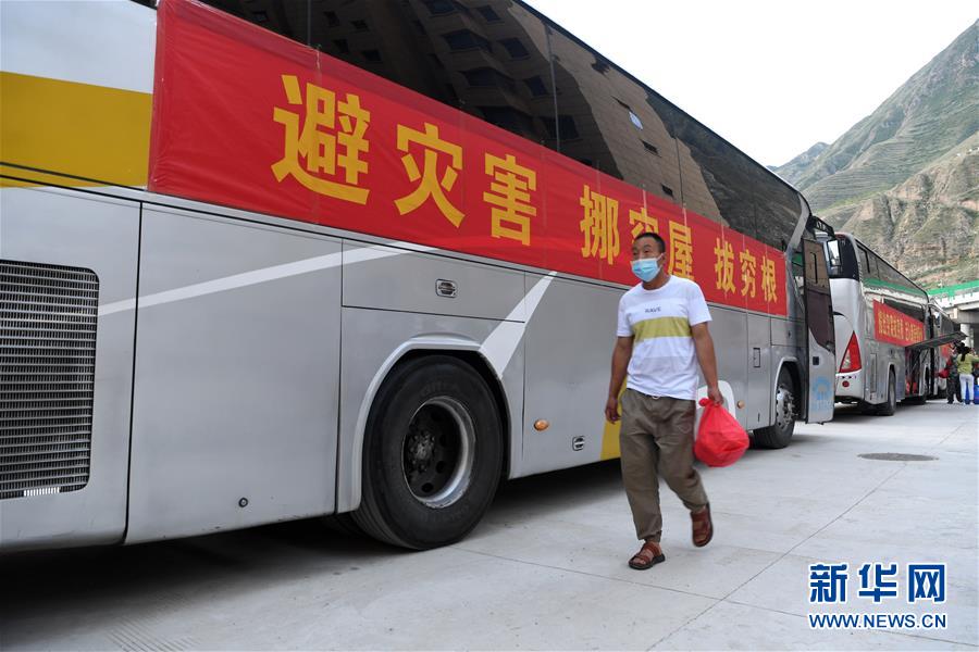 在舟曲縣地質(zhì)災(zāi)害避險搬遷首批搬遷群眾轉(zhuǎn)運點,首批搬遷群眾集中乘車前往蘭州新區(qū)(8月7日攝)。新華社記者 范培珅 攝