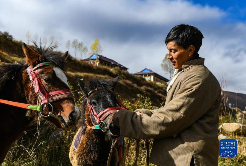 在甘孜縣來馬鎮(zhèn)格通村,村民在查看幼馬的生長情況(10月25日攝)。新華社記者 王曦 攝