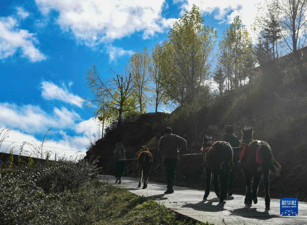 在甘孜縣來馬鎮(zhèn)格通村,村民將完成馴化訓練后的幼馬帶回(10月25日攝)。新華社記者 王曦 攝