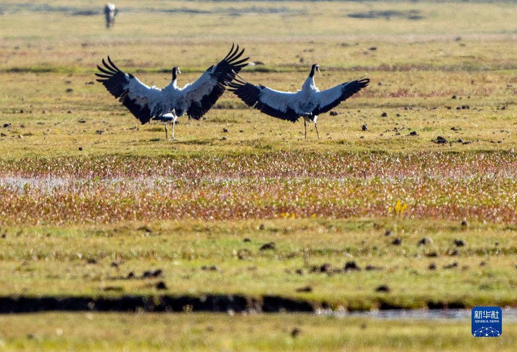 10月29日,黑頸鶴在納帕海嬉戲。新華社記者 江文耀 攝