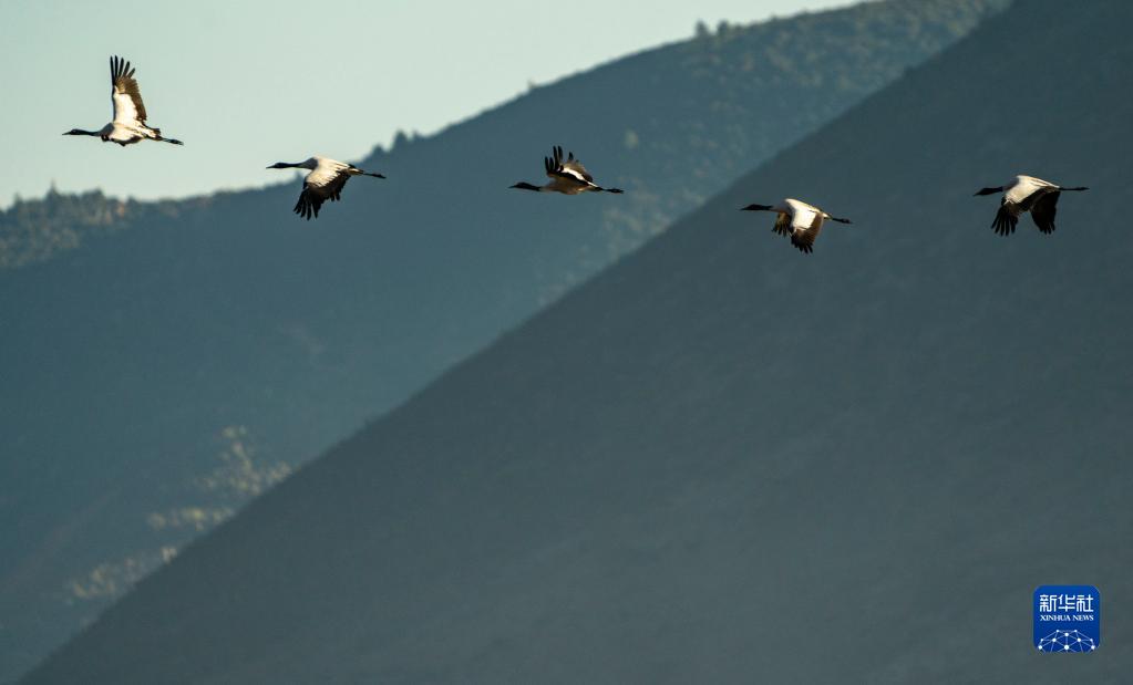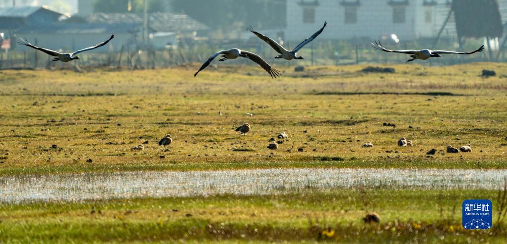 10月29日,黑頸鶴飛翔在納帕海上空。新華社記者 江文耀 攝