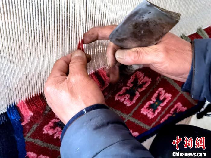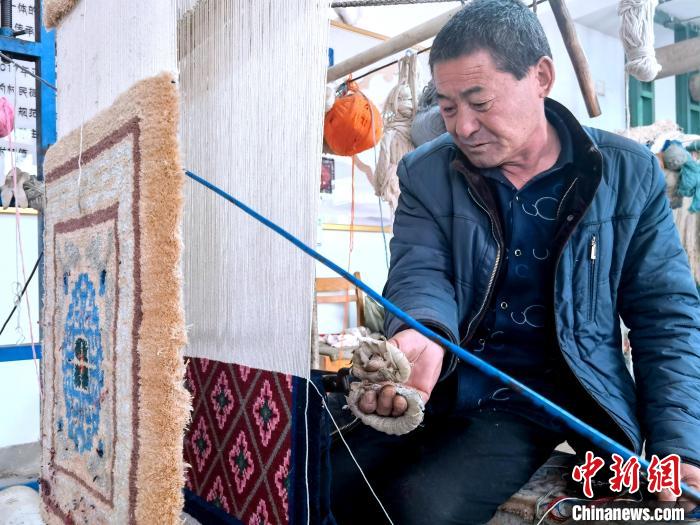 20日,記者在加牙藏族織毯傳習(xí)所里見到了國(guó)家級(jí)非物質(zhì)文化遺產(chǎn)加牙藏族織毯技藝的傳承人——59歲的楊永良。他正坐在織毯架前忙活著。