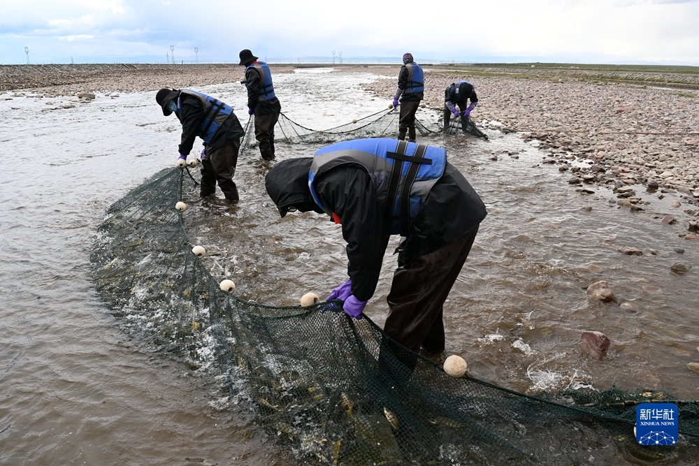 6月29日,工作人員在剛察縣境內(nèi)的泉吉河中采捕親魚。新華社記者 范培珅 攝