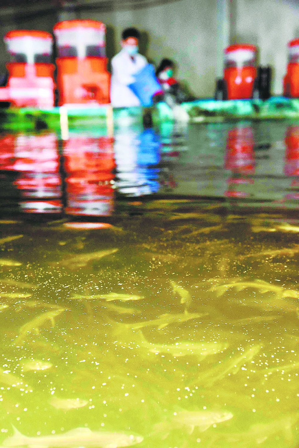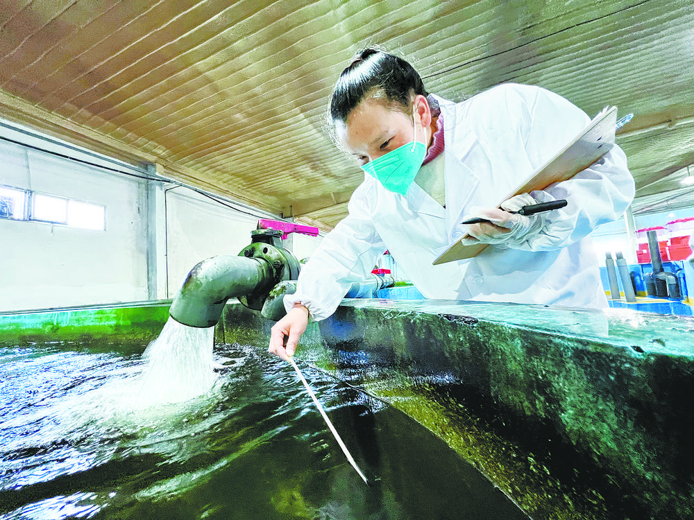 技術(shù)人員對循環(huán)水養(yǎng)殖池育苗投喂。
