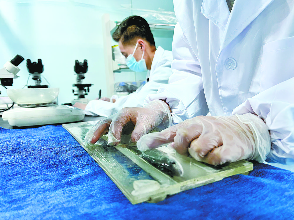 技術(shù)人員正在測量魚體的身長。