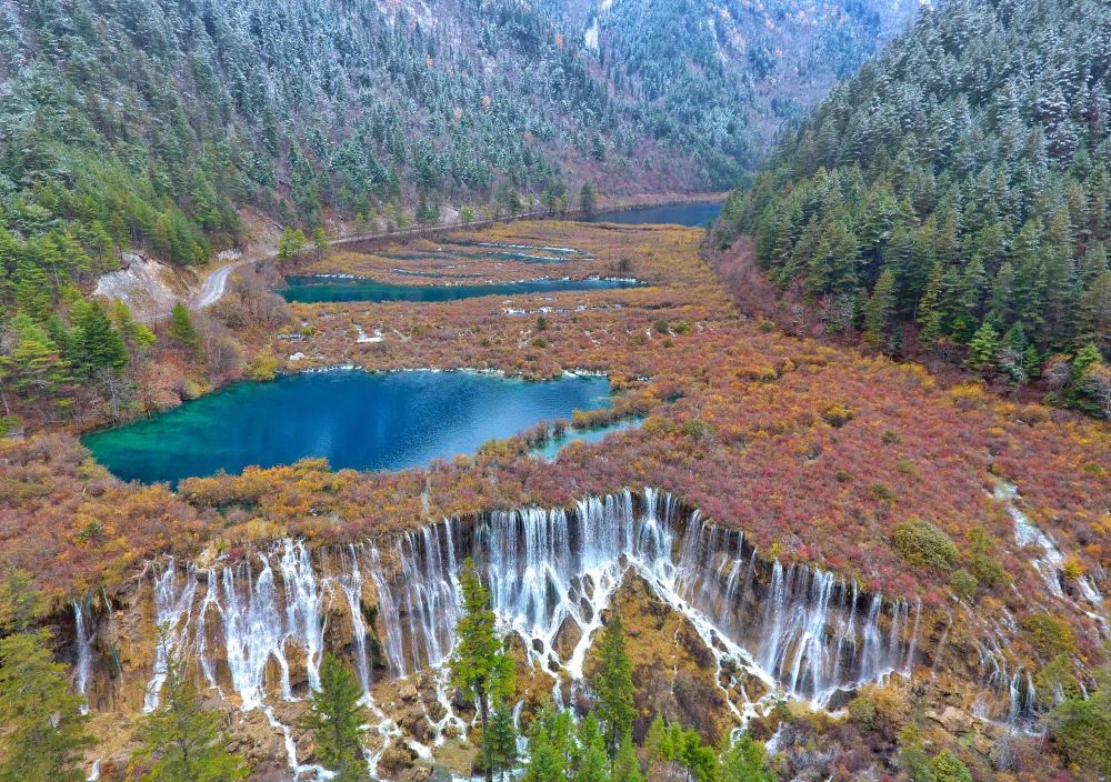 四川九寨溝景區(qū)諾日朗瀑布及諾日朗群海(2018年11月6日攝,無人機(jī)照片)。新華社記者 劉坤 攝