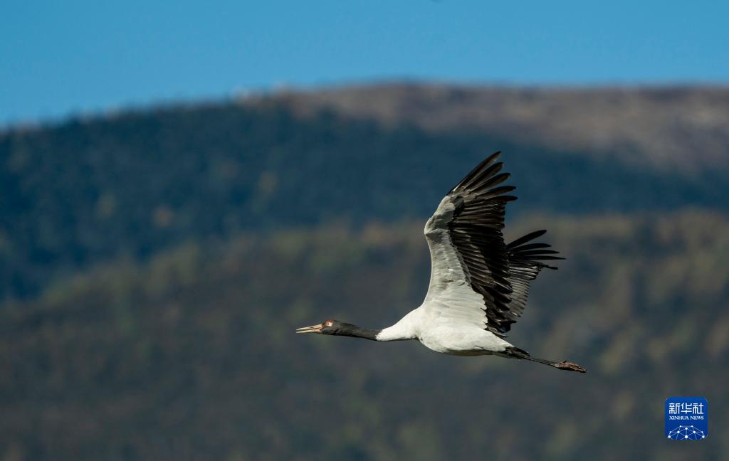 2月21日,黑頸鶴在納帕海展翅起飛。中新社記者 劉冉陽(yáng) 攝