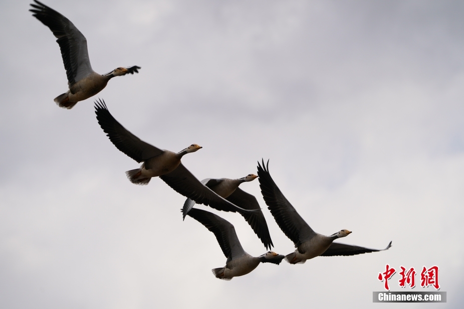 2月21日,納帕海上空展翅高飛的斑頭雁。中新社記者 劉冉陽(yáng) 攝