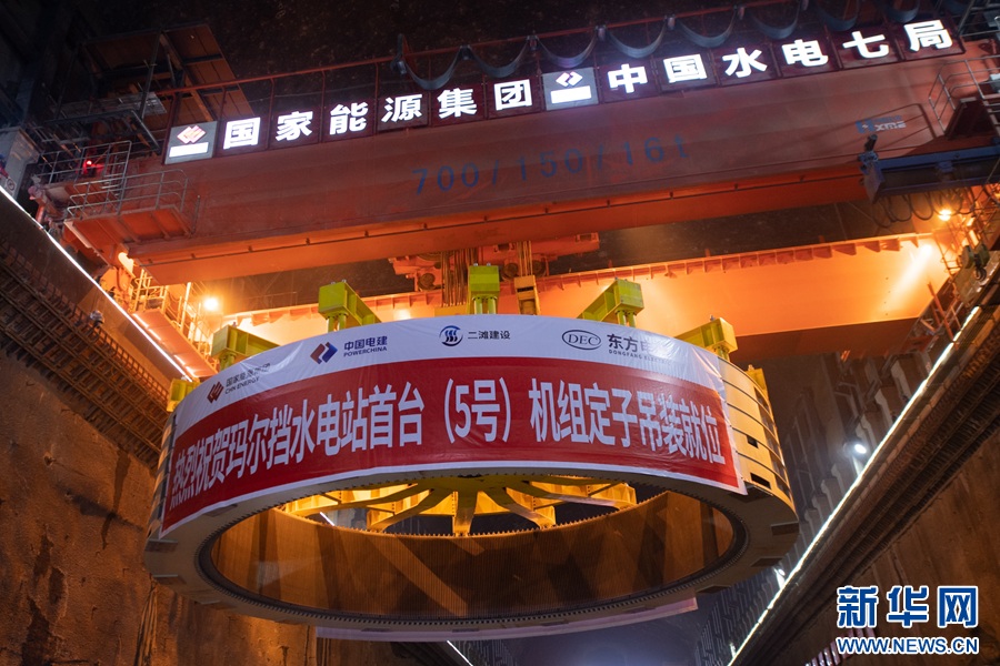 6月30日,瑪爾擋水電站首臺機組定子吊裝作業(yè)現(xiàn)場。新華網(wǎng) 潘彬彬 攝