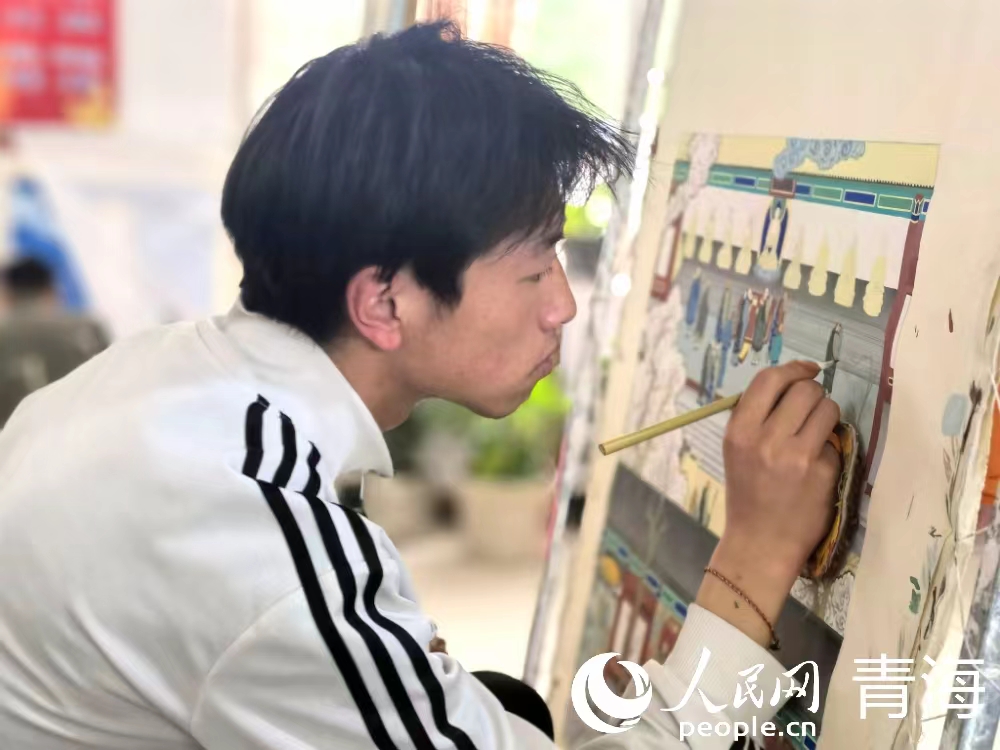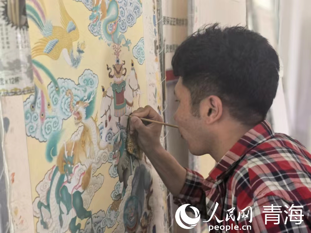 專心作畫(huà)的多杰東智。人民網(wǎng) 馬可欣 攝