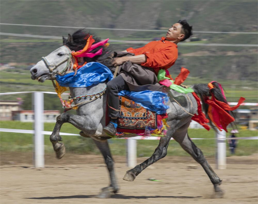 走馬賽場塵土飛揚,馬兒四蹄快速且有節(jié)奏地蹬地,馬身卻平穩(wěn)地從眼前呼嘯而過,飛速穿過終點,看得人眼花繚亂。7月17日上午,“2023四川甘孜山地文化旅游節(jié)”活動之一的走馬表演活動,在被譽為“中國走馬之鄉(xiāng)”的甘孜縣來馬鎮(zhèn)會師走馬場上舉行,吸引省內(nèi)外上千游客前來欣賞。