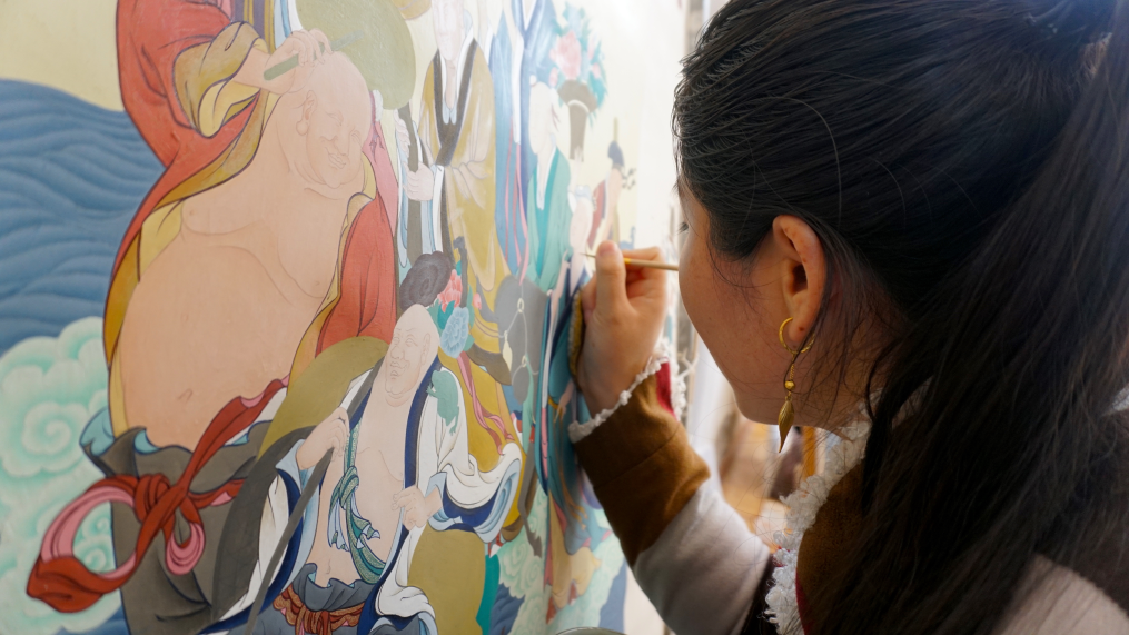 “以前只在展館里欣賞過唐卡作品,沒想到還可以親自繪制,這樣的旅游體驗(yàn)很特別?!北本┯慰蛯O女士拿著畫筆,在熱貢桑杰唐卡畫院體驗(yàn)繪制唐卡。