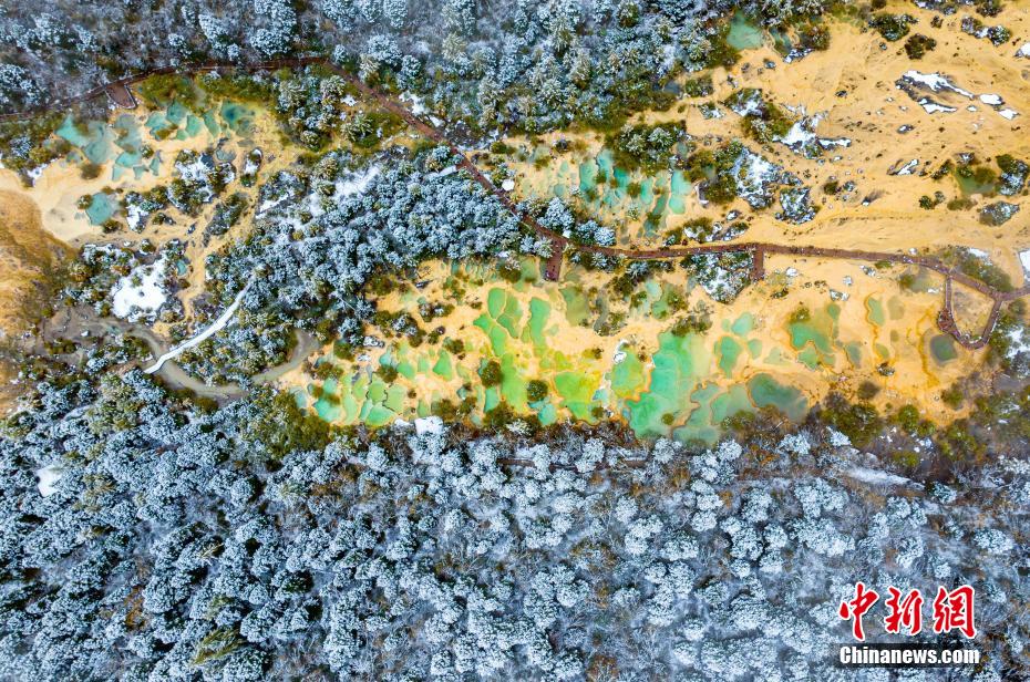 10月12日,被譽(yù)為“人間瑤池”的四川松潘黃龍景區(qū)迎來降雪。白雪覆蓋了彩池旁的原始森林、棧道、古寺,白雪與池水相映,宛如童話世界。