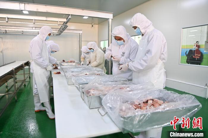 10月31日,走進(jìn)碌曲縣洮源牧場農(nóng)牧發(fā)展有限責(zé)任公司,一派繁忙景象。圖為工人在對(duì)牦牛肉進(jìn)行精細(xì)分割。九美旦增 攝