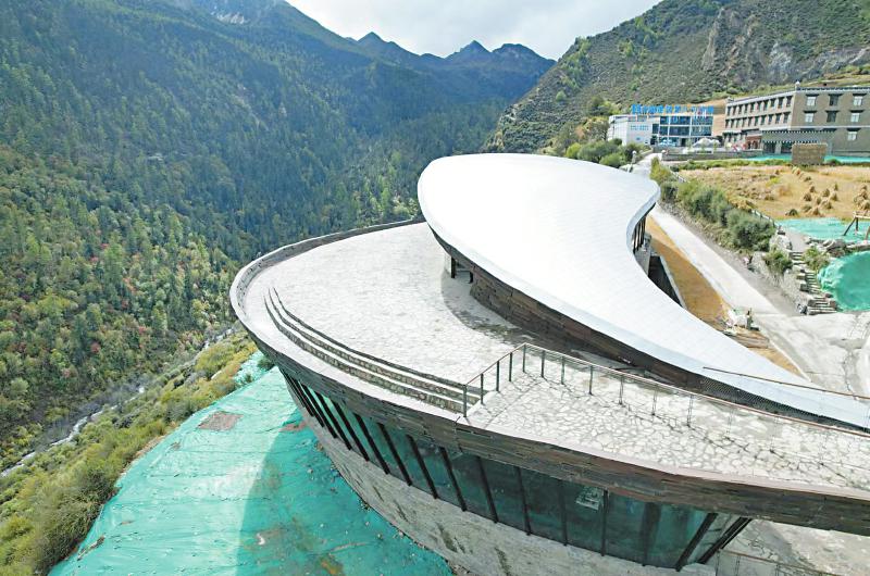 走出展廳就到了“亞丁陽臺(tái)”,項(xiàng)目總設(shè)計(jì)師、中建西南設(shè)計(jì)研究院總建筑師劉藝介紹,陽臺(tái)與村子以橋相連,其創(chuàng)意是讓游客在感知天地遼闊之后,轉(zhuǎn)身又可回歸煙火生活。