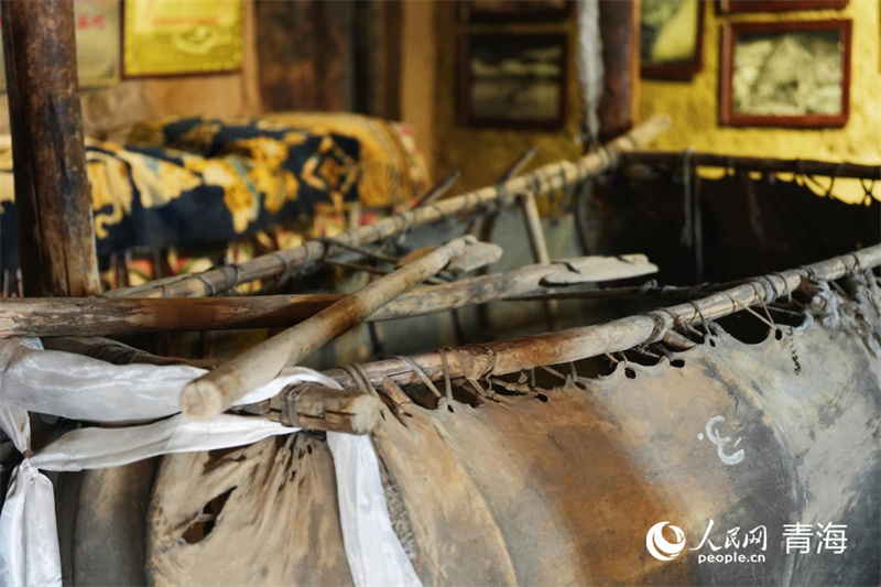 以前通天河畔群眾的渡河工具——牛皮筏。人民網(wǎng) 楊啟紅 攝
