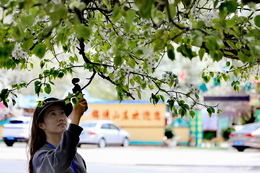 圖為游客在盛開的梨花下拍照留念。新華網(wǎng) 黃開森 攝