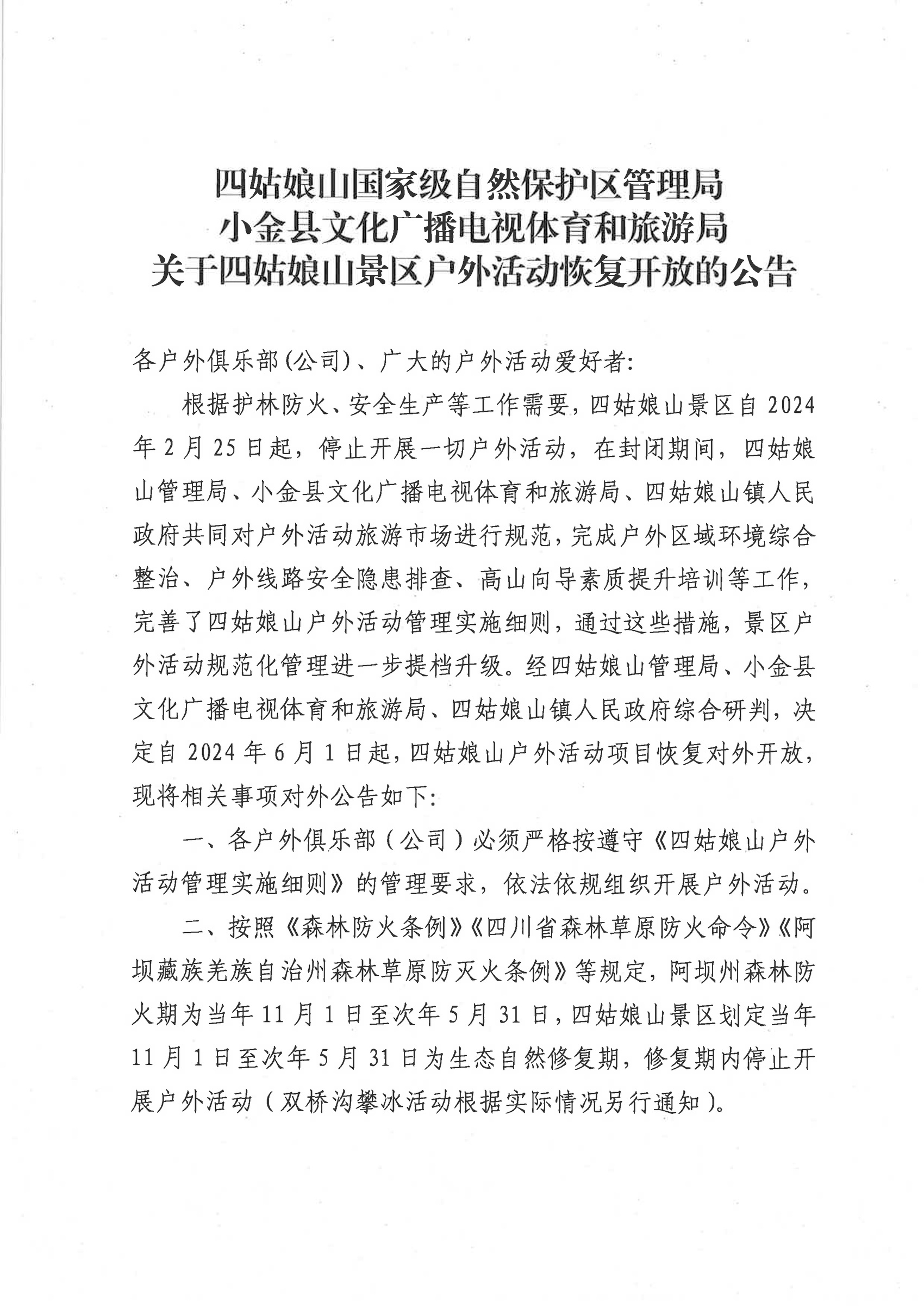 經(jīng)四姑娘山管理局、小金縣文化廣播電視體育和旅游局、四姑娘山鎮(zhèn)人民政府綜合研判,決定自2024年6月1日起,四姑娘山戶外活動項目恢復(fù)對外開放。公告要求各戶外俱樂部(公司)必須嚴(yán)格遵守《四姑娘山戶外活動管理實施細(xì)則》的管理要求,依法依規(guī)組織開展戶外活動。