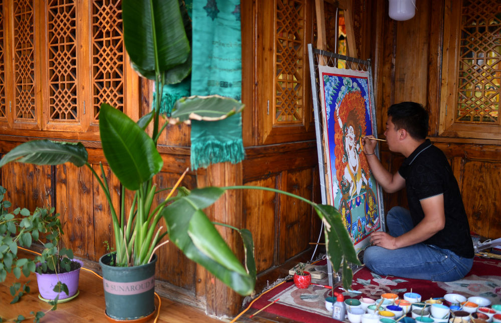唐卡畫師桑杰卡在同仁市郭麻日村的家中繪制唐卡。新華社記者 張宏祥 攝