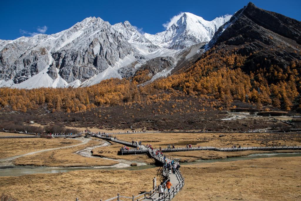 近日,位于四川省甘孜藏族自治州的稻城亞丁景區(qū)秋韻正濃,吸引眾多游客前來游覽。