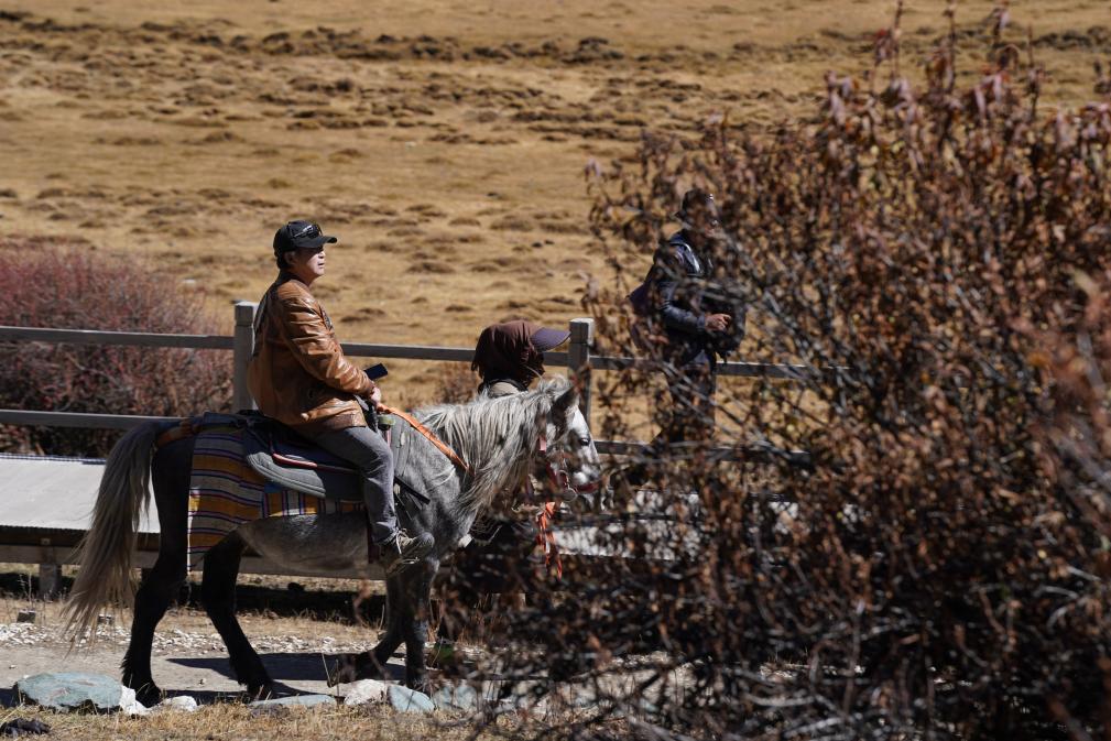 10月31日,游客在四川省甘孜藏族自治州稻城亞丁景區(qū)內(nèi)騎馬。新華社記者 胥冰潔 攝
